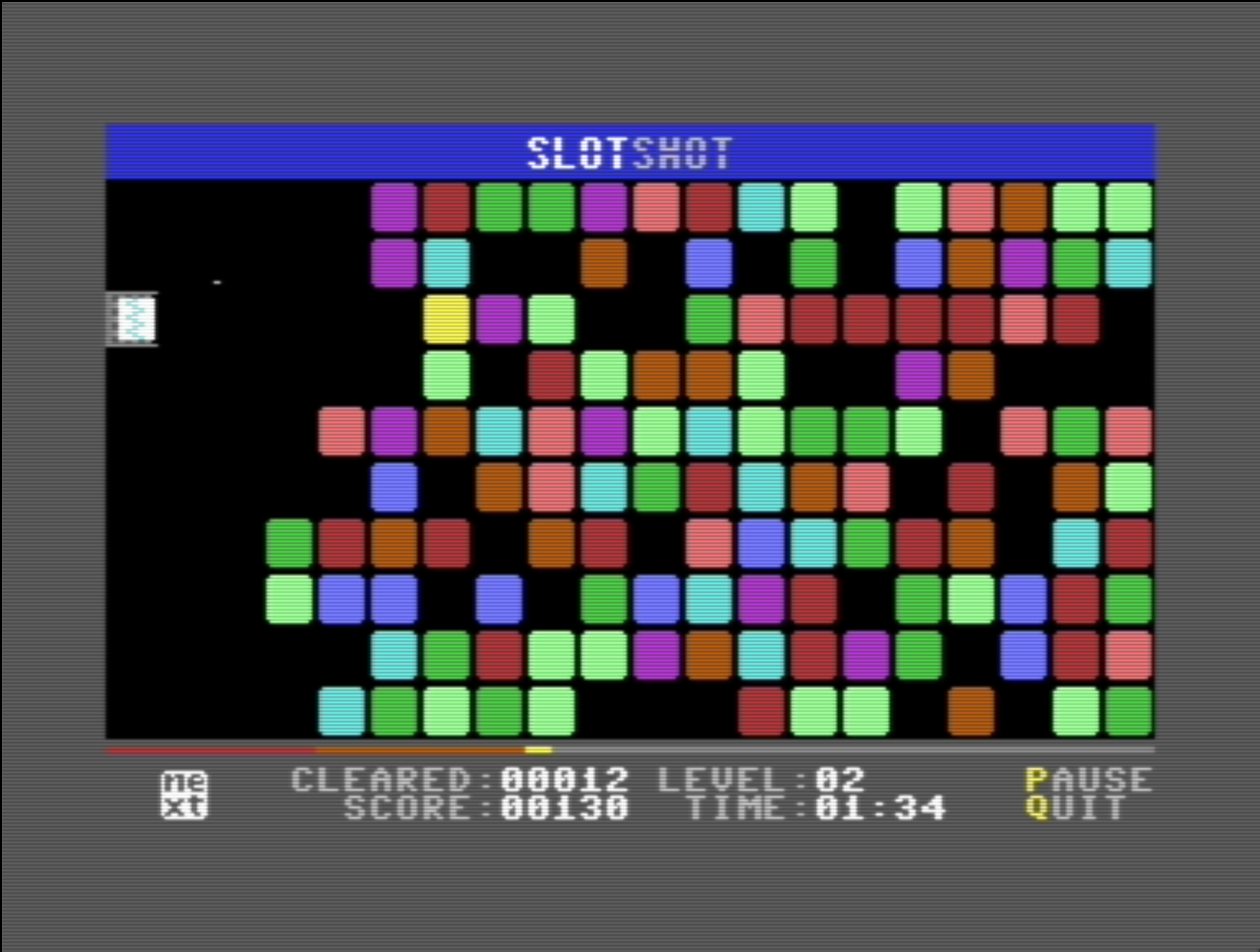 SLOTSHOT is a unique blend of puzzle and shooter mechanics designed for the Commodore 64. Set on Deep Space Colony K-7 in the year 2084, you must stop a mysterious crystalline growth from consuming the station by shooting colored vaccine blocks through gaps to neutralize entire columns.
